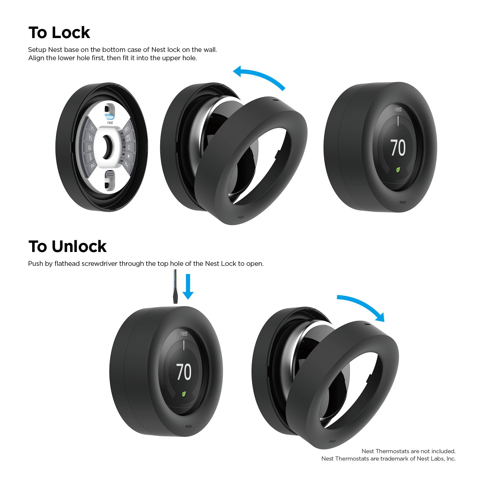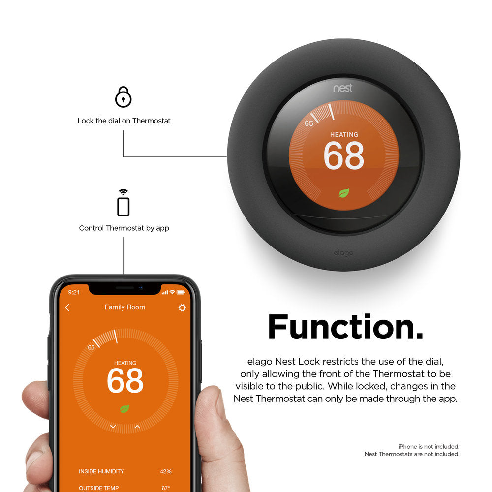- FUNCTION: elago Lock Case restricts the use of the dial, only allowing the front of the Thermostat to be visible to the public. While locked, changes in the Nest Thermostat can only be made through the app.